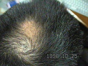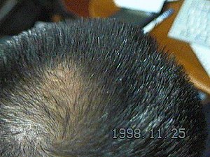 顧みれば俺様は数年前から頭髪が少なくなり始めた.これは次第に広がる一方で, 決して元に戻るものではないことを覚悟していた.父親が結構若い頃からハゲていた 経緯もあり,ハゲ始めた現実には従順になれた…. 我が父親は,必死に少ない毛をハゲたところに撫で付けて隠していたが,傍からは 丸見えで,ほとんど隠蔽の効果はなかった….^_^; 俺様はスポーツ刈りで,ハゲの 進行状況は,傍目にもつぶさに観察が出来るのだ. 自分では頭頂部が余り観察出来ない.ハゲると解ってからは,さして気にもせず, 成り行きに任せていた.手で触った感触で,ツルツルした部分が次第に広がる傾向を 自覚していた.然し,何故か最近,異変が起きた. ふと,頭に手をやった瞬間『アレ? 何でここに毛があるんだ?』額の右の入江が 妙にふさふさした毛の感触があって驚いた.ツルツルで額の上の,この真中部分など 円く毛を囲むハゲを形成する勢いがあった筈だが? 頭頂部の円いハゲと同じ円い毛を残して,ハゲと毛髪の円形が無限大の記号を作る 面白い対照になる芸術的な瞬間が訪れるかも知れないと,ハゲる経過を何処かで逆に 楽しむ気分もあった.それが突然裏切られ始めた. ただ頭髪は,手触りの感触で有るように感じられていても,見た目ではハゲている 現実があって,進行が気づきにくい傾向がある.だから毛の感触があっても,実際は ハゲている外見には変わりがない状況にはある…. 然し,今まで頭頂部のツルツルした感触は少しずつ増え始めていたことは確かで, 頭を洗う時など,それでも多少の期待をもって,ハゲの部分を揉み解すように刺激を 与えたが,ハゲの範囲は広がるだけで無駄だった. つまり,マッサージを繰り返していてもツルツル部分は次第に広がりつつあった. だから,やっても無駄な刺激であったと言える.別段,効果を期待した訳でもない. 頭の血行を良くする中身への刺激の意味もあった. ところが,気がついてみれば,頭を洗う時に滑る部分がほとんどなくなって来た. 額の右側の入江に,毛の存在を感じてから,改めて頭頂部のツルツル部分を探すと, 殆どなくなった.然し,密度が薄くハゲは見える. 頭頂部の特にハゲが著しい一番のツルツル部分も,カサブタのようなザラザラした 感触が感じられて,少しずつ毛根から毛が生え始めるようになってしまった.一体, 俺様に何が起きたのか? この歳でハゲが治る…? あるいは,ハゲと言えどもハゲ続けるばかりではなく,時に少し毛が生えることも あるのだろうか? そう思ってもみたが,手触りの毛の感触は次第に増えて,最近は うっとうしいとさえ感じるようにすらなっている. 本当に増えているのか? ビデオカメラを使って,画像をパソコンに取り込んで, 毛の生え具合を記録してみた.方法は,ビデオカメラを頭の上にかざしてパソコンの 画面に表示させ適当な瞬間を画像として取り込む. ビデオで見る映像は,合わせ鏡で見る映像と違って,何故か,ハゲが目立ちにくい 印象を受ける.従って毛の伸びた状態が,やや誇張されて写る気がするが,手触りで 感じる感触を素直に映像にした状態とは似ている. 毛が生え始めた原因は… 今年の7月,新聞に折り込まれていた一枚のチラシの文字に目に止まった.そこに 『体の膿を出すナタマメ』と書かれていた.俺様は,その言葉に『これは俺様に合う 何かがあるっ!』直感的にそう感じたのであった. 巷には,様々な健康法とか健康食品が溢れている.俺様は,どれもこれも基本的に いかがわしいものだとの先入観がある.だから,様々なそのテの広告は,普通ならば 目に止めることもない.然し,何故かその時は…. その頃,なりを潜めていた慢性的な痔が少々活動を開始して厄介なことになったと 感じていたことも広告に目が止まった理由かも知れぬ.更に慢性的に常にどちらかの 鼻が詰まる蓄膿の症状も子供の頃から続いていた. 小学生の頃,首の後ろと腹部のヘソの上辺りに大きな吹き出物が出来て,そこから 毎日のようにドクドクと膿が出た.その頃『たこの吸出し』という塗り薬があって, それを塗ると信じられぬ位の膿が出たものである. 首の後ろにポッカリと大きな穴があく位の酷い膿であった.首の真中に穴があいて 危ねぇんじゃねぇか? などと仲間のワルガキ共も心配したものだが,その程度では 昔はわざわざ医者なんかには行かなかったものだ. 『体の膿を…』という言葉を見て,唐突にそんな昔のことが思い出された.慢性的な 持病には,膿が関連しているのかも知れぬ….治ったとする体験談が掲載されている パターンの何となくいかがわしい広告だったが…. 『蓄膿が治った,痔が治った,アトピーが治った,腫瘍抑制作用がある云々』要は, 紹介しているナタマメ茶を飲めば,健康にいいという内容だった.いかがわしいとは 一方で思いながら,俺様はそのお茶を申し込んだ. だが,飲んで二日目には,鼻の奥がスッキリするという信じられぬ現象が起きた. 無論,それで完璧に治った訳ではないが,近年,体験したことのない爽快感だった. 痔も活動を止めて,妙におとなしくなって来た…. 漢